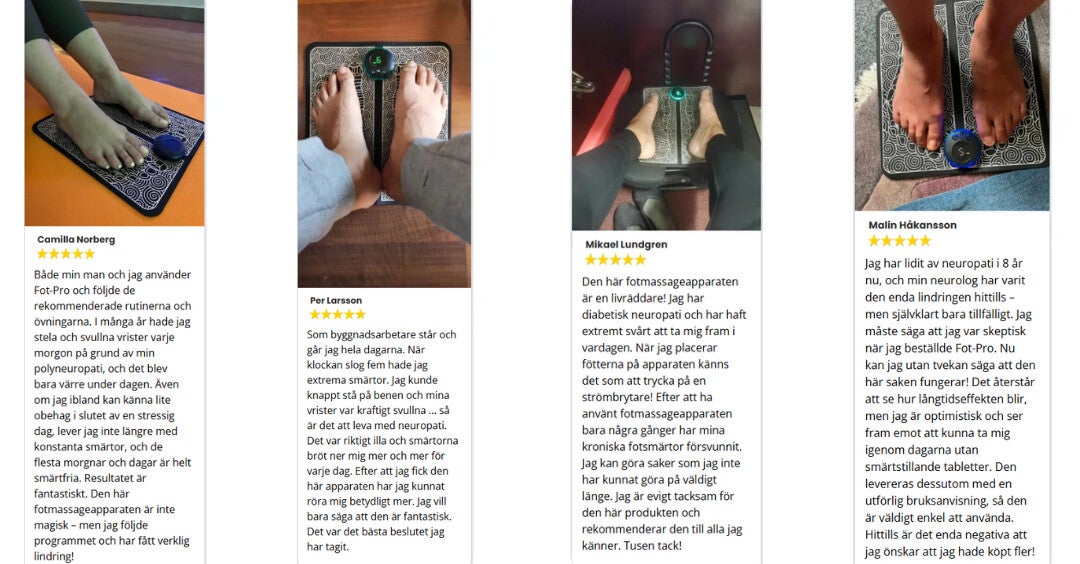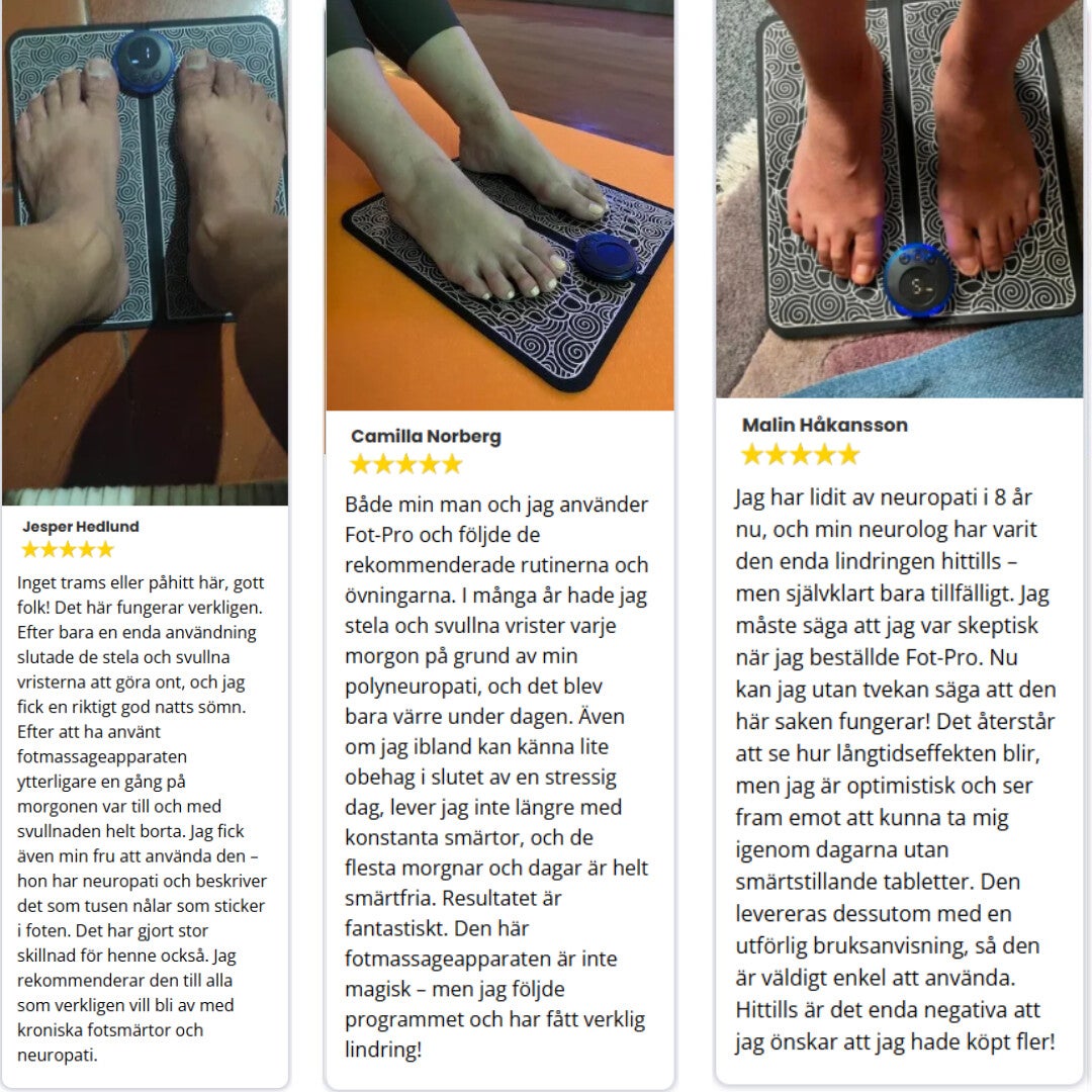 "Jag kunde inte sova på grund av de neuropatiska fotsmärtorna och den irriterande domningen – tills jag provade Fot-Pro fotmassageapparaten. Tack gode Gud för att du delade dina erfarenheter, Erik!"