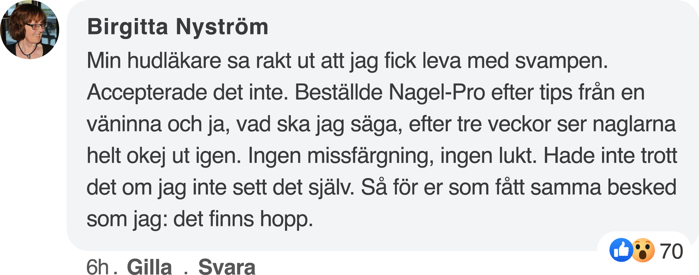 Nu kan jag med handen på hjärtat säga att mina naglar är friskare än någonsin. Jag gruvar mig inte längre för att ta på mig skorna eller vara rädd för att någon ska stirra på mina fötter när jag tar en promenad i kvarteret. Nagel-Pro har verkligen förändrat mitt liv och jag kunde inte vara nöjdare. Den har gett mig hopp om en framtid där jag slipper oroa mig för att nagelsvamp ska begränsa mig. Tusen hjärtligt tack till Dr Lindqvist och EQUILIVA!"