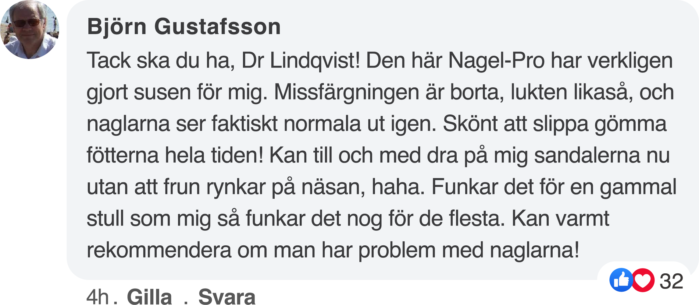 Hej Elin Sjökvist, Nagel-Pro är helt fantastisk! Jag led tidigare av allvarlig nagelsvamp på fötterna, men dessa här apparater har verkligen satt stopp för det! Under det senaste året var både förtjockningen av naglarna och den dåliga lukten så besvärliga att jag trodde att jag aldrig skulle kunna leva ett normalt liv igen. Men Nagel-Pro fungerar helt fantastiskt. Hoppas verkligen att den också kommer att hjälpa dig! Jag hade en telefonkonsultation med Dr Lindqvist – han är en trevlig och hjälpsam läkare, och en genuint fin människa!